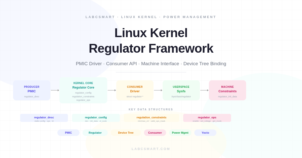 The Linux regulator framework has been designed to interface and control voltage and current regulators. It is divided into four separate interfaces which are the followings: